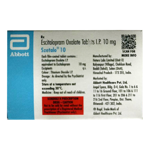 SZETALO 10MG TABLET contains Escitalopram which works by increasing the levels of a chemical called serotonin in the brain, which helps improve mood. Serotonin is a neurotransmitter that affects emotions, and people with depression or anxiety may have low levels of it. Escitalopram blocks the reuptake (reabsorption) of serotonin into nerve cells, which makes more serotonin available to improve communication between brain cells. This helps reduce symptoms of depression and anxiety over time.
